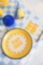 Paperinen pöytäliina leikkisällä sinisävyisellä kuviolla, koristeltu pienillä banaaneilla ja reunalla suloisilla Minions-hahmoilla. Värikäs ja juhlava yksityiskohta, joka muuttaa juhlapöydän nopeasti ja luo ihanan pohjan kattaukselle. Pöytäliina on 120 x 180 cm ja valmistettu FSC-sertifioidusta paperista.
